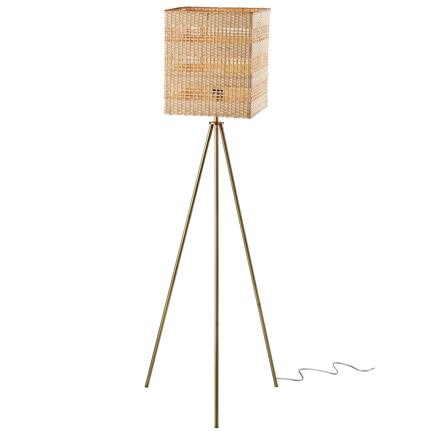 The strong coastal design elements and contemporary silhouette of the Bondi Floor Lamp bring effortless style to living rooms, offices, bedrooms, and more. The clean lines of three legs with an antique brass finish form a tripod design. This base supports a large rectangular light rattan shade with heavy texturing for a stunning look that gently disperses the light. For versatile lighting options, a 3-way rotary socket switch easily adjusts the brightness between low, medium, high, and off.