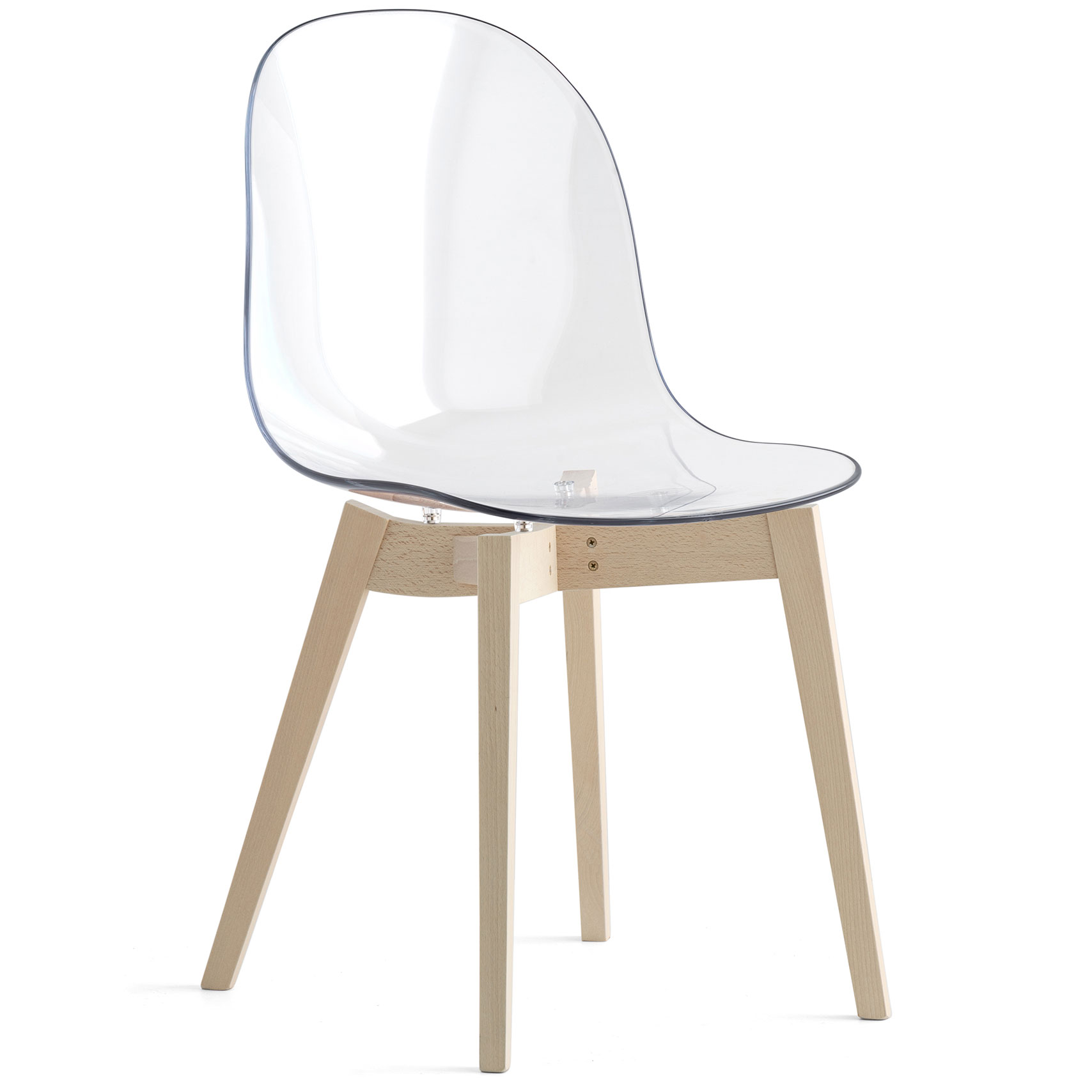 The Academy Transparent Chair is enriched with a seat in transparent polycarbonate. The versatility of this model remains and proves to be a must for those who want comfort and style in a single chair. Supported by beech wood frame.