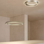 The Tidal Ceiling Light features a ring-shaped silhouette with one side slightly wider than the other. This irregularity causes the fixture to appear differently as it is viewed from different angles, creating a sense of movement reminiscent of the tides or planets in orbit. Tidal directs light both upwards and downwards for an ethereal, floating appearance. The fixture attaches to a standard US junction box at the wider end of the ring, with all technical components hidden inside, for a clean appearance with no canopy required. ELV/TRIAC dimmable at 120V; 0-10V dimmable at 277V.