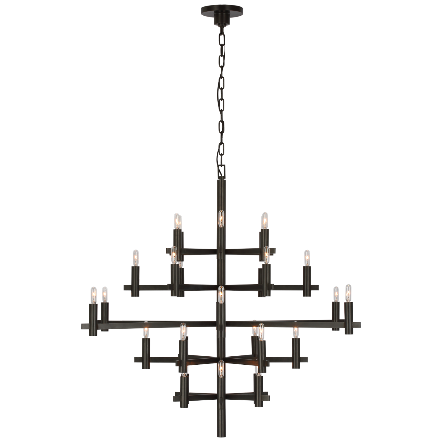 The Sonnet Chandelier casts a bright glow of ambient illumination with its 30 lights distributed across a multi-tiered frame. Straight arms radiate from the center to form a sleek modern design, making the Sonnet an ideal centerpiece for an entryway, living room, or dining room.