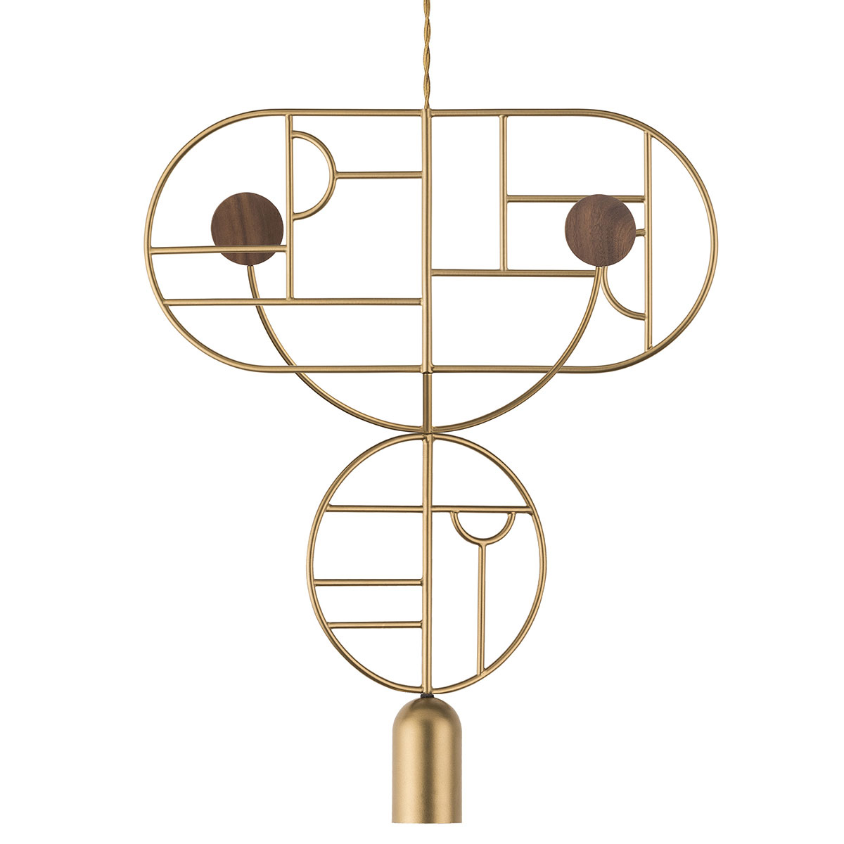 The Wooden Dots Pendant offers an artistic expression that is as much a decorative sculpture as it is a light fixture. The pendant features a cylindrical downlight with a frame decorated by geometric designs. The frame is composed of independently rotating circular and oval sections with a curved arm adorned with colored metal or walnut dots for a mobile-like appearance. Its unique look embodies Nomon's philosophy of creating jewelry for the home.
