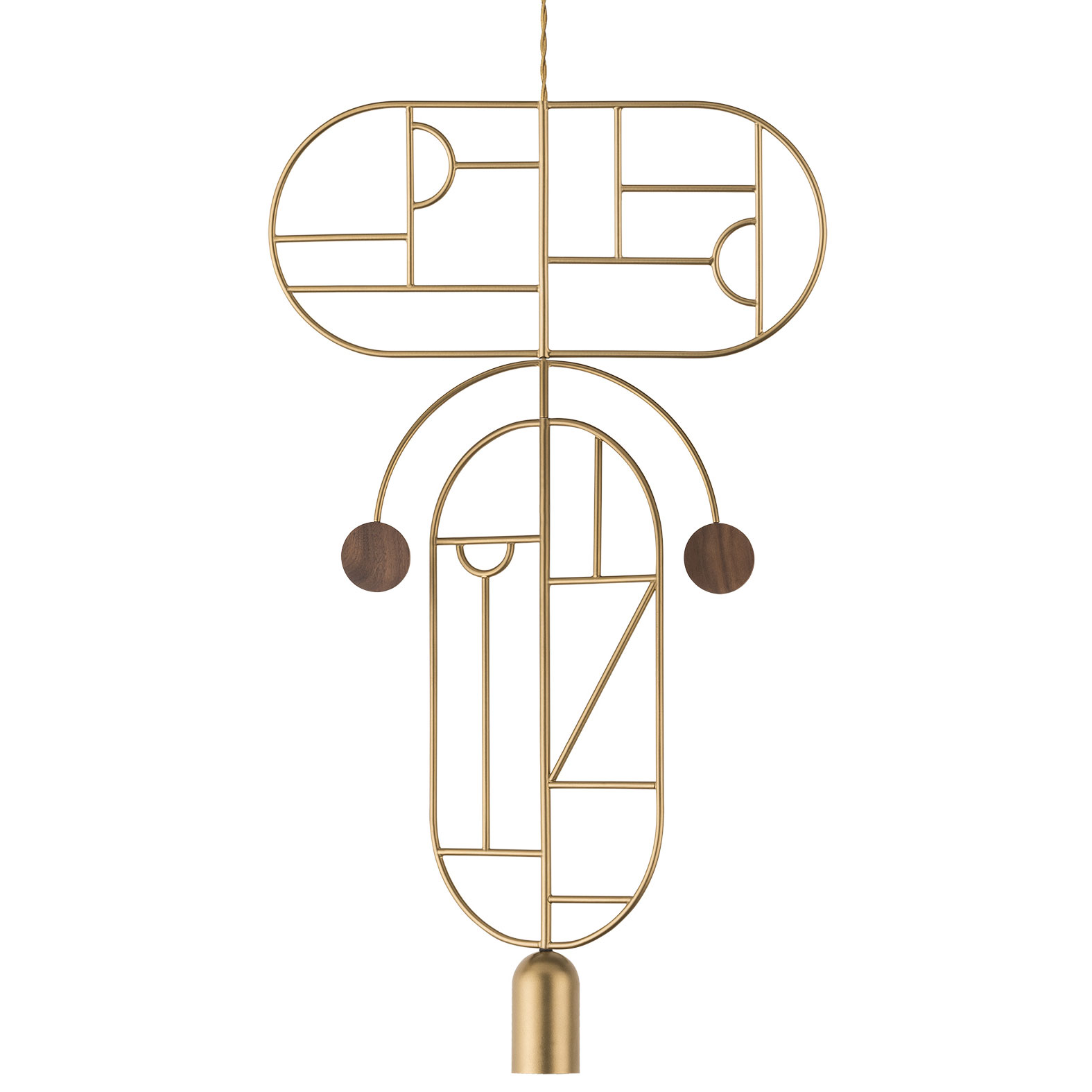 The Wooden Dots Pendant offers an artistic expression that is as much a decorative sculpture as it is a light fixture. The pendant features a cylindrical downlight with a frame decorated by geometric designs. The frame is composed of independently rotating oval sections and an arm adorned with colored metal or walnut dots for a mobile-like appearance. Its unique look embodies Nomon's philosophy of creating jewelry for the home.