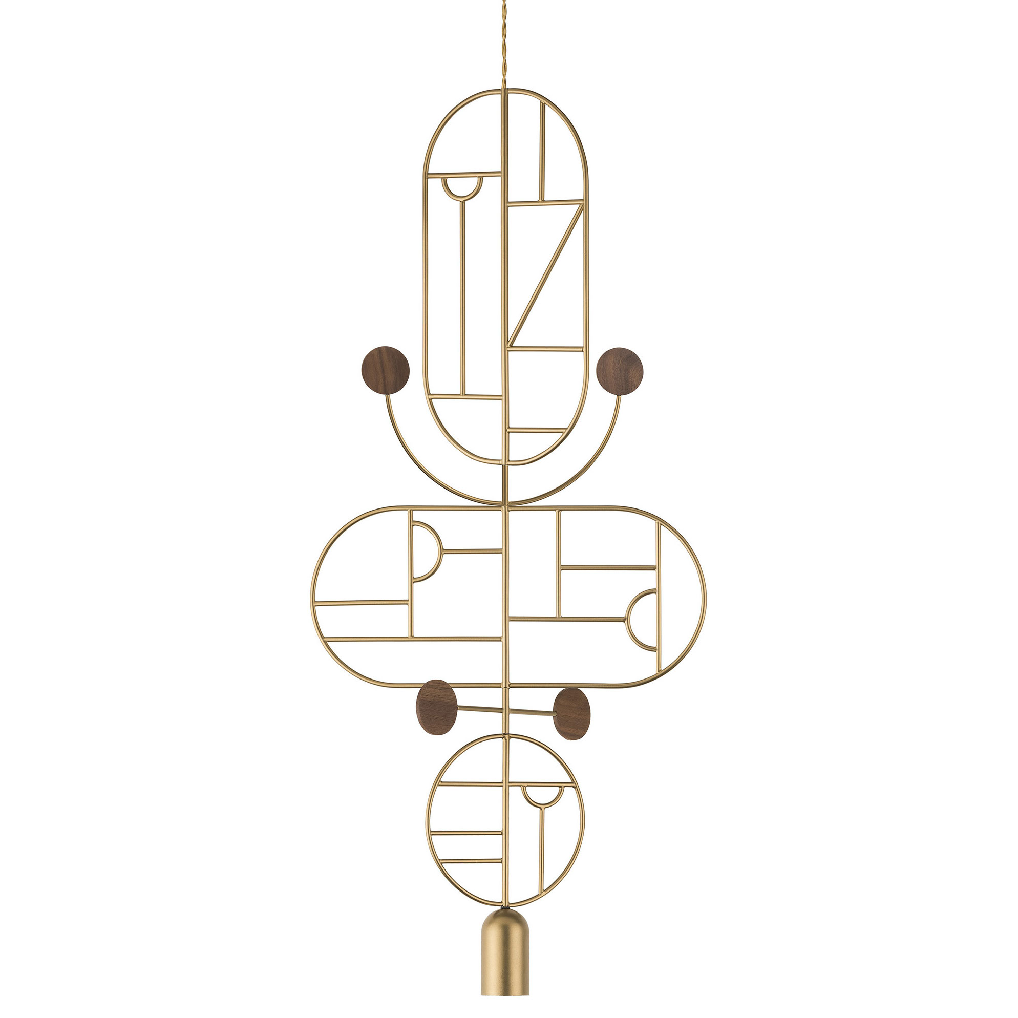 The Wooden Dots Pendant offers an artistic expression that is as much a decorative sculpture as it is a light fixture. The pendant features a cylindrical downlight with a frame decorated by geometric designs. The frame is composed of independently rotating oval and round sections and arms adorned with colored metal or walnut dots for a mobile-like appearance. Its unique look embodies Nomon's philosophy of creating jewelry for the home.