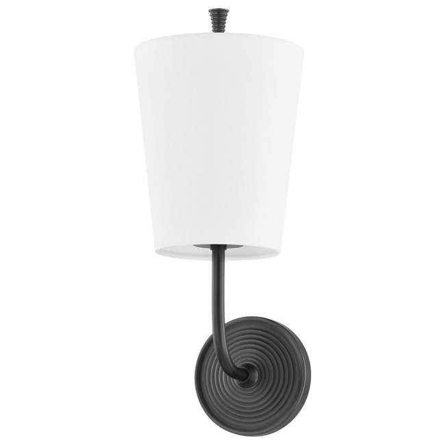 The Gladstone Wall Sconce is a timeless tribute to playful shapes and contemporary geometries. Featuring a tapered white linen shade with a large opening at the top, it creates a powerful uplight, brightening up dark ceilings to make a room feel more spacious. The distinctive swirled backplate and matching finial add contemporary whimsy.