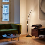 The Dew Drops Floor Lamp is inspired by droplets of moisture sparkling on a thin blade of grass. The lamp features clear crystal shades lit by an internal LED light source gracefully balanced on a curved stem clad in black vegan leather for a playful but elegant look. On/off switch located on cord.