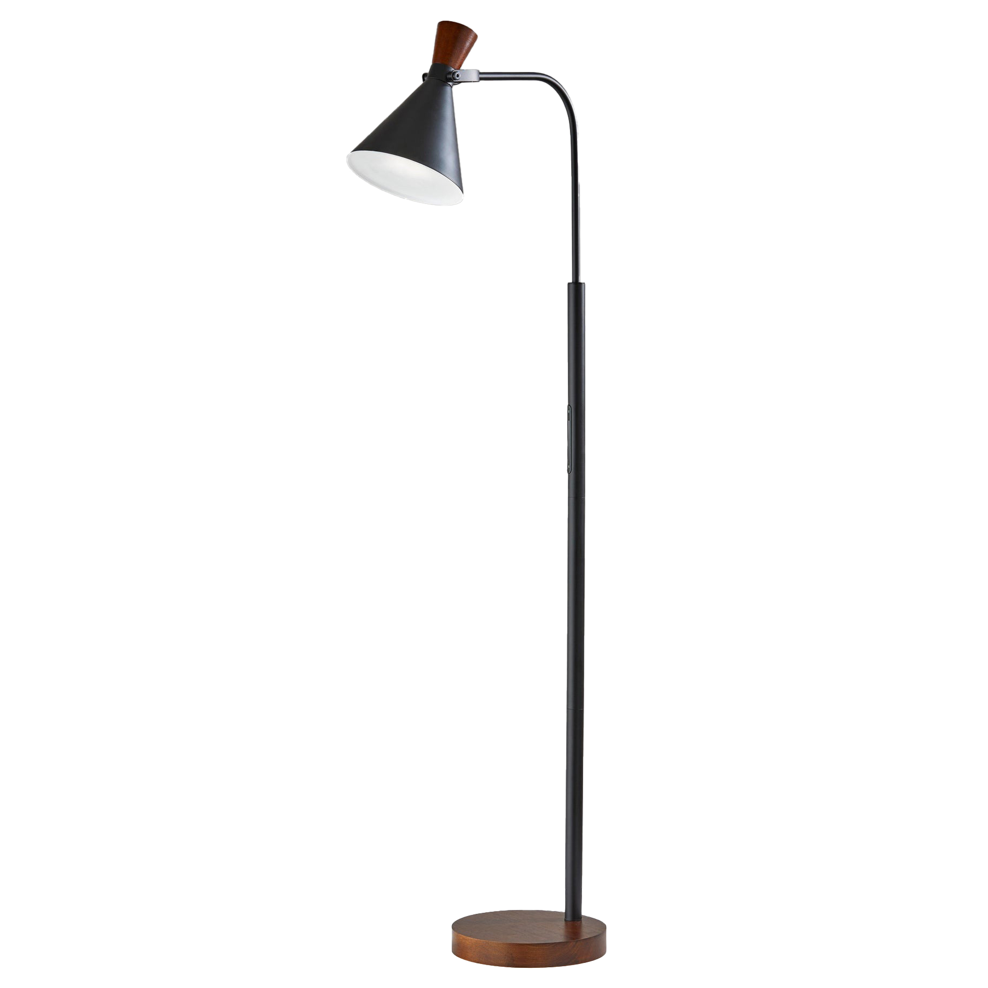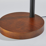 The humble design combines a round wood base with a simple curved arm and metal shade for the perfect ensemble for your bedroom, living area, or office. The Led Task Floor Lamp features a solid round base made of wood, while the stem in black and walnut finish leads to a cylindrical glass shade that is to softly diffuse the light. Includes on/off touch switch on stem.