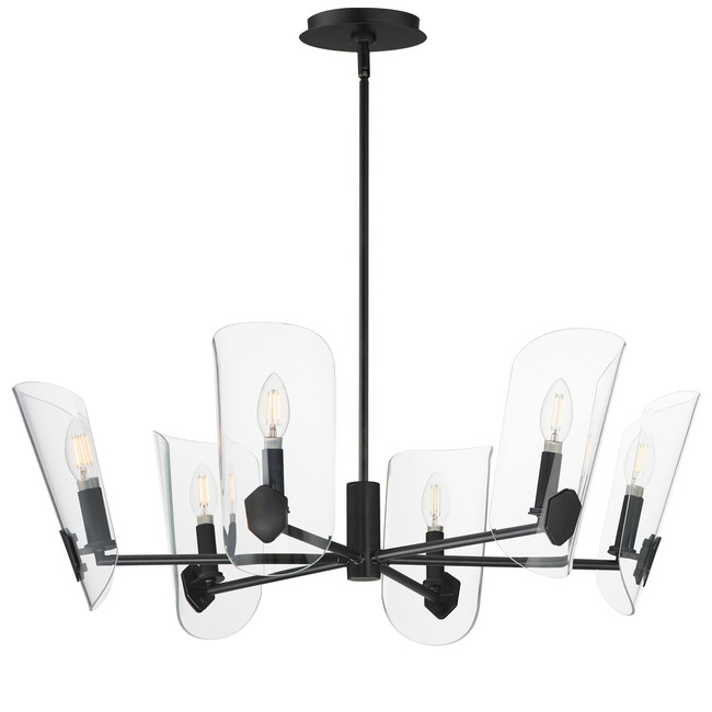 A Coat of Arms in curved Clear glass shades bevel cut and shaped to resemble traditional shields radiates off slender tubular arms is the Armory Chandelier. The streamlined design takes on a transitional approach with imaginative details that carries through to the concept for the chandelier.