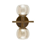 The Chamberlin Wall Sconce brings an alluring mix of antique brass-plated iron hardware and smoke luster glass, two globe lights are contrasted with a textural bar detail at the center. This piece is at home in acontemporary or industrial setting. May be mounted horizontally or vertically.