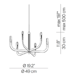The J-us is an unusual interpretation of the traditional chandelier with arms. The central cylindrical aluminum structure provides an electrified track on which to attach the copper and fiberglass arms of the chandelier. The arms are positioned freely by inserting and sliding them into the structure slots and are completely concealed from view. The luminous performance and dynamic design offers great visual appeal. Phase cut dimming.