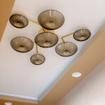 Drawing inspiration from natural branching forms, the Birmingham Ceiling Light makes a boldly modern art statement. The design features starburst cast topaz Piastre glass shades and clear etched glass shades, facilitating an interplay of light, texture, and shape. Its unique scale and silhouette create a sculptural, immersive experience that draws the eye. TRIAC dimming at 120V. 0-10V dimming at 277V.
