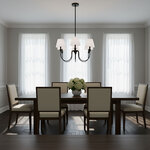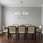The Elsay Chandelier brings a sophisticated look to your interior space. The central ball holds curved arms, complemented with subtle cylindrical and spherical details and topped with cone shaped linen shades that casts warm shadows across your room. Sloped ceiling to 22 degrees maximum.