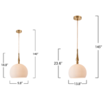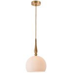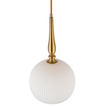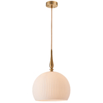 The Kate Pendant light exudes timeless elegance with its brushed brass holder and white ribbed spherical glassware, casting a soft, inviting glow. A textile-covered wire adds sophistication while ensuring easy height adjustment for versatile placement.