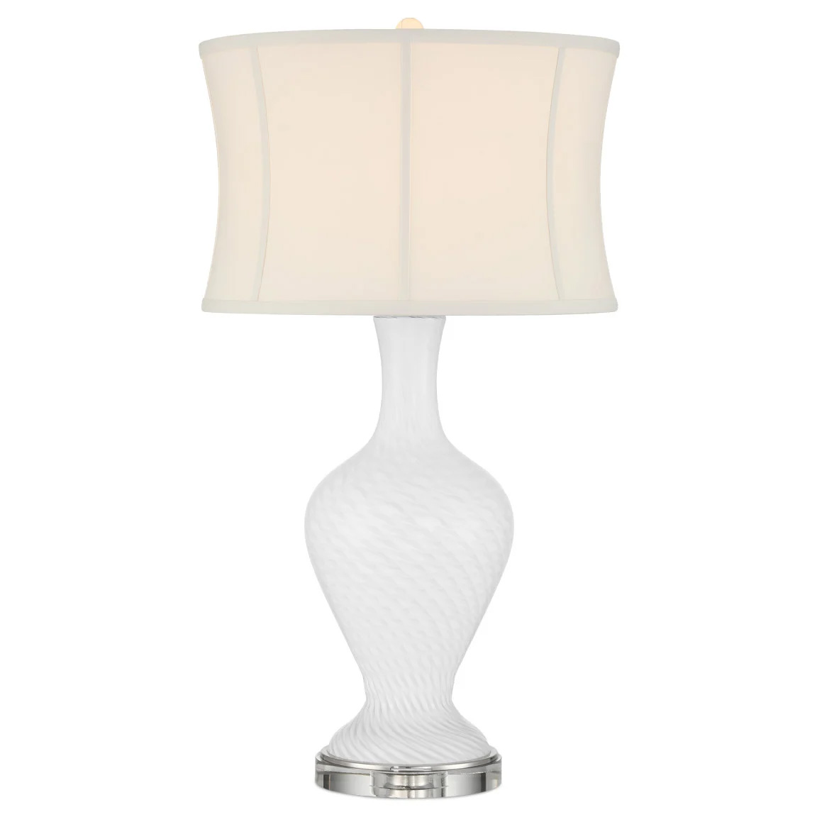 Made in the Venetian tradition of Zanfirico, the Zeta Table Lamp features a tone-on-tone design flowing across a baluster-shaped body. Heated rods of glass are fused and then pulled to create the unique twisting spirals. The lamp is topped with a classic shade and secured with a polished nickel finial. 3-Way switch on socket.