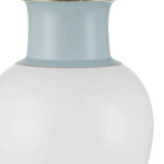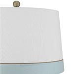 The Kora Blue Table Lamp is a timeless classic, perfect for an entry or living room. The white porcelain body features bold strips of celadon glaze, mirrored in the polyester shade. A very thin brown line creates a simple divider between the blue at the bottom the white. The brushed brass cap that sits just below the shade matches the round finial on this lamp. 3-Way switch on socket.