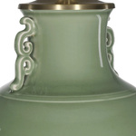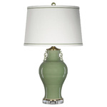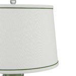 The Londonderry Table Lamp features an elegant Chinoiserie fusion of English design and Ming-Dynasty inspired ornamentation. The porcelain body is finished in a luminous sage green and fitted with an antique brass details and an optic crystal base and finial. A polyester off-white shade is trim in green for the final touch. 3-Way switch on socket.