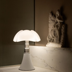 The Pipistrello Classic LED Table Lamp is an iconic mid-century design that will add a playful element to any interior. The opal white methacrylate shade recalls the look of a parasol or outstretched wings. The flared base features a telescoping stem to adjust the lamp's overall height, which is held in place by a decorative round finial in matching finish. Dimmer switch located on cord.