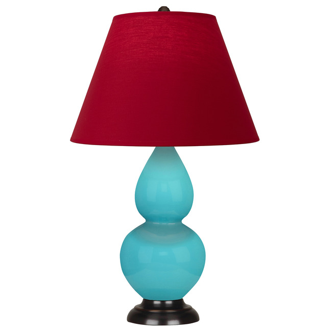 The Small Egg Blue Double Gourd Table Lamp brings a graceful beauty to your interior space. The unique, curved body rests on a Deep Patina Bronze base and is topped with a cone shaped shade that is lined in an offset color. The shades with a colored interior lining create a gradient effect on the lamp's body when illuminated. Full range dimmer is located on the lamp socket.