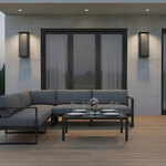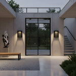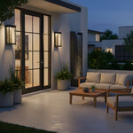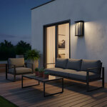 The Faywood Dark Sky Outdoor Wall Light brings a timeless simplicity to your exterior space. The smooth rectangular frame is complemented by glass panels that allow warm light down, across your area.