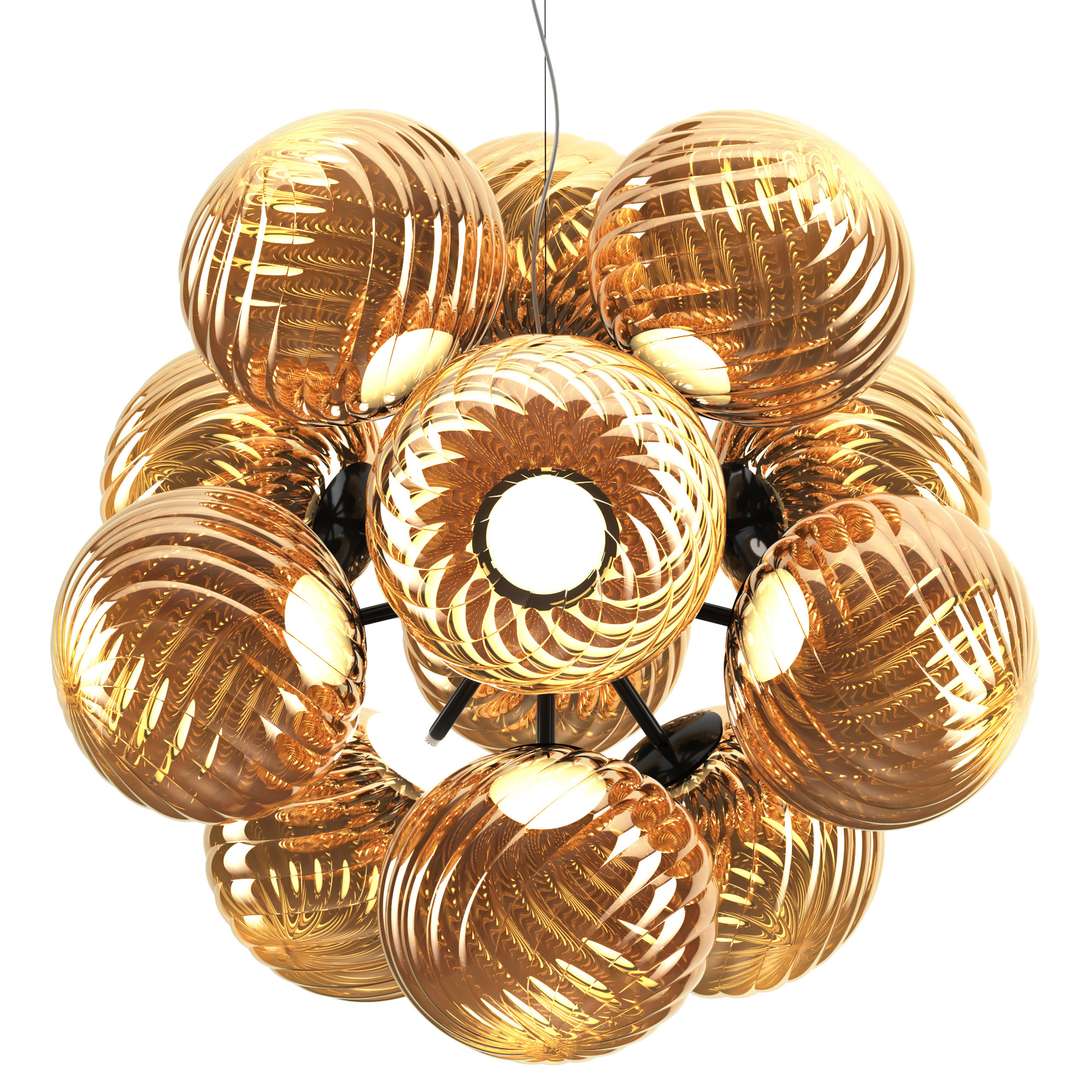 The Melt Burst Chandelier is a stunning fixture with a large scale perfect for occupying volume in a lobby, entryway or communal space. Twelve hypnotically spiraling polycarbonate shades produce a myriad of dazzling reflections as they branch outwards from a sputnik-like frame to form a cluster of light. ELV and Standard 120V dimmable.