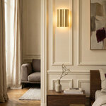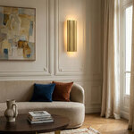 The Haussman Wall Sconce draws inspiration from Georges-Eugne Haussmann's urban renewal of Paris in the 1800s. Haussman's style was defined by symmetrical facades, steep mansard roofs, and decorative details with classical motifs. The wall sconce was created as a deconstruction of this iconic style, with the pleated brass shade recalling the look of a column or ornate molding seen in Haussmann-style buildings. In addition to providing a decorative texture, the brass shade shields light from the integrated LED light source to produce a warm, indirect glow.