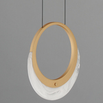 Named for the Greek constellation associated with music and harmony, the Lyra Single Pendant strikes a poetic balance between sculpture and light. Crescent-shaped cast glass, swirled in clear and white, is cradled in golden rings and suspended by slender black cables to evoke weightlessness. Rhythmic and refined, Lyra's composition echoes the curve of a lyre--ideal for stairwells and double-height spaces seeking a statement of modern minimalism and mythic beauty.
