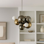 Evocative of turbulent skies, the Stormy Pendant is a sculptural masterwork that transforms negative space into visual drama. A billowing cluster of stainless-steel spheres, finished in a moody interplay of Black Nickel, French Gold, and Polished Chrome, creates an abstract cloudscape of extraordinary depth. Floating among the forms, matte white glass globes in varying sizes emit a layered, ambient glow, while discreet canopy-mounted downlights provide refined functionality. Offered in two commanding sizes, Stormy is both art and atmosphere--an expression of elemental motion rendered with impeccable precision.