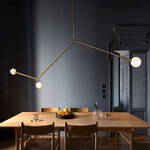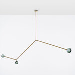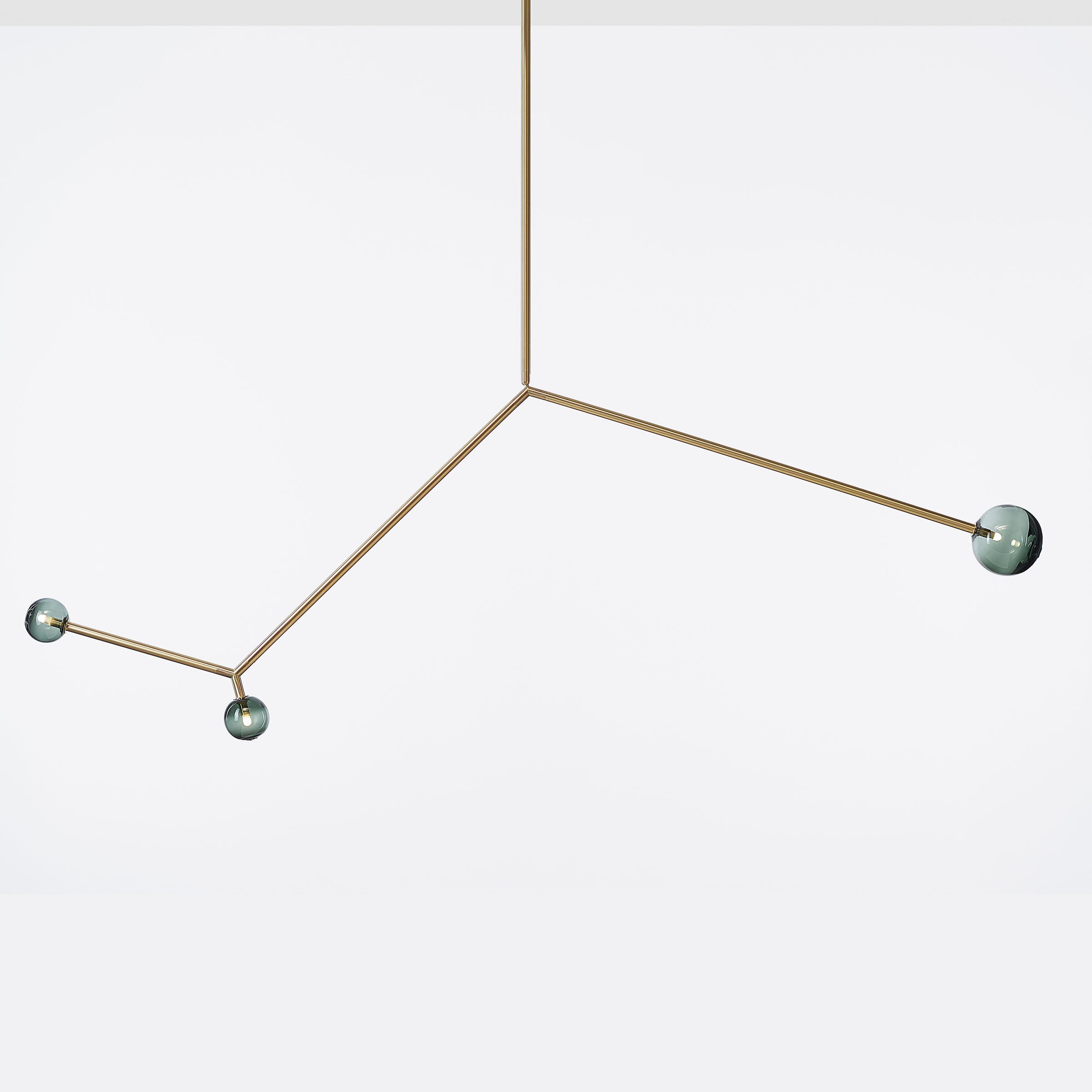 The Angle 3.0 Pendant offers a striking but also light and airy composition with its sleek tubular brass frame and minimalist glass globe diffusers. The angled, asymmetrical frame creates a dynamic look. Subtle variations in the weight of the handblown glass globes cause each pendant to tilt at a slightly different angle, making each pendant a one-of-a-kind object and adding understated variation when multiple pendants are installed together.