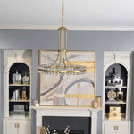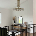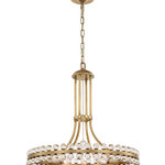 The Clover Chandelier is an eye catching piece that features glimmering rows of hand blown Clear glass balls and smooth curves finished in Aged Brass.