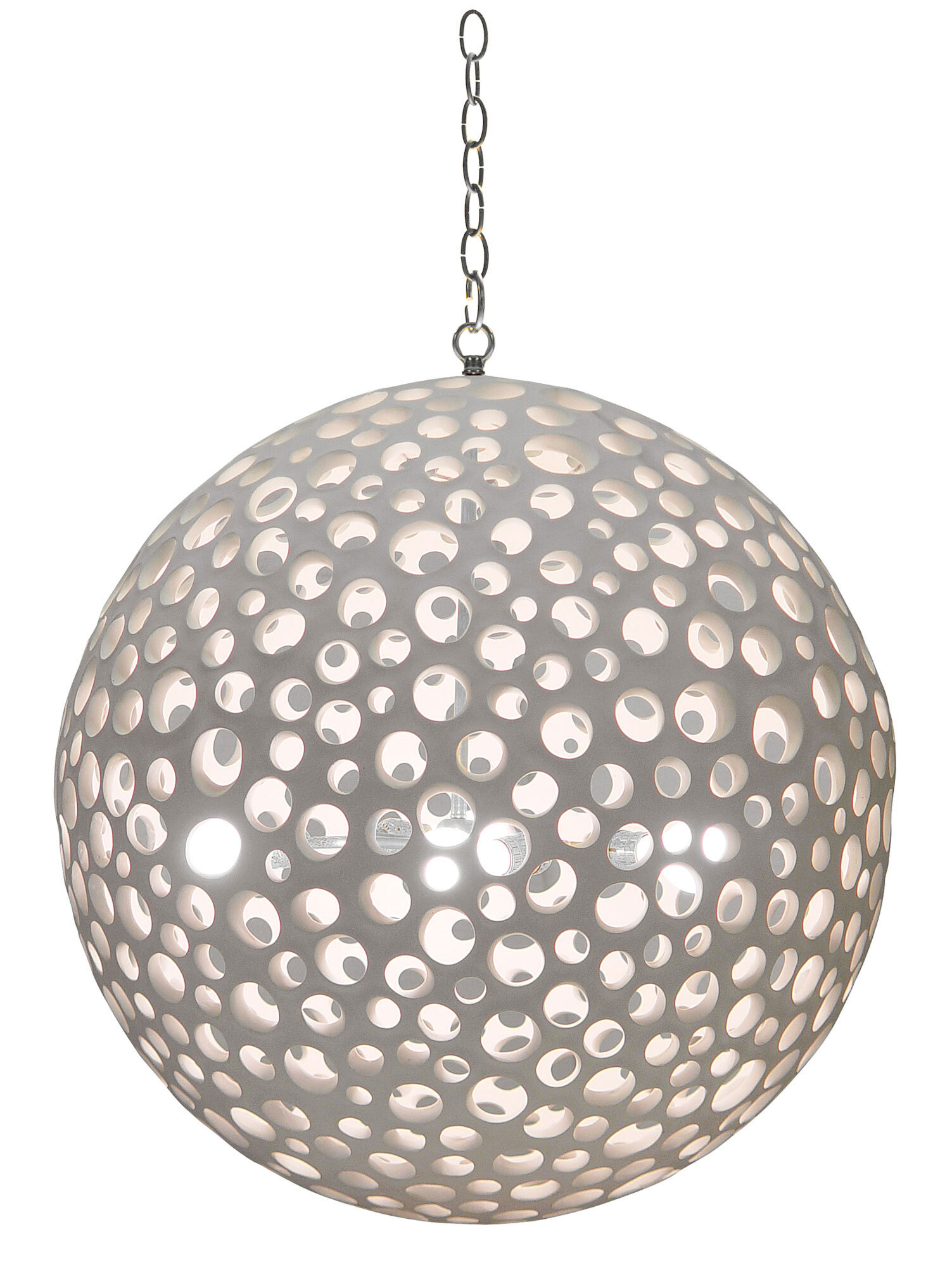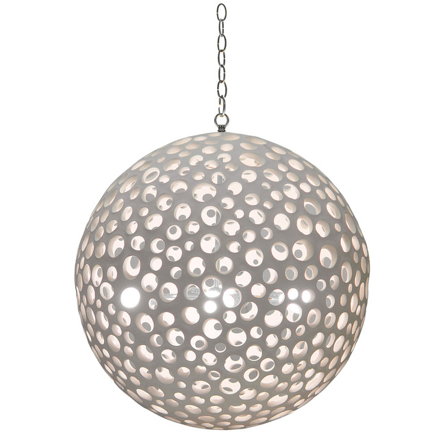 The Annika Chandelier brings a unique look to your interior space. The largo orb has circular cutouts to create warm lighting shadows across your space. Available in White or Pearl with a Silver or Gold finish. Canopy: 5 inch diameter.