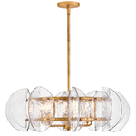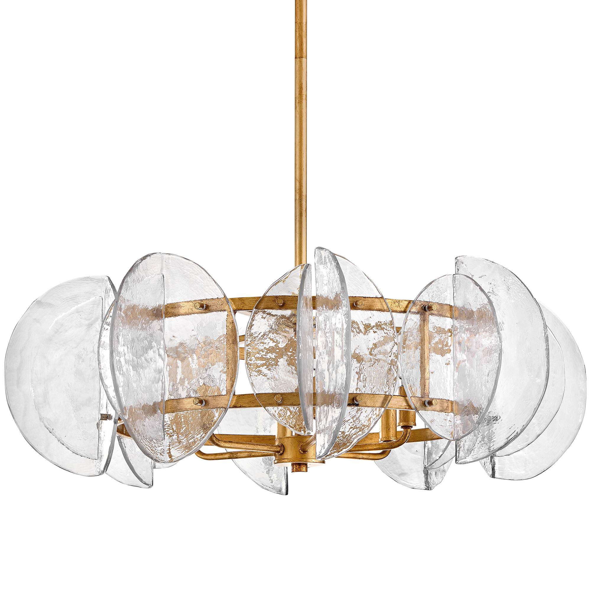 Opulent folded panes of textural water glass surround the Seraphina Chandelier's glamorous, distressed frame, creating varied refractions and softly diffusing warm illumination throughout your space. A versatile yet stately silhouette makes a chic transitional statement in both modern and traditional settings.
