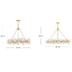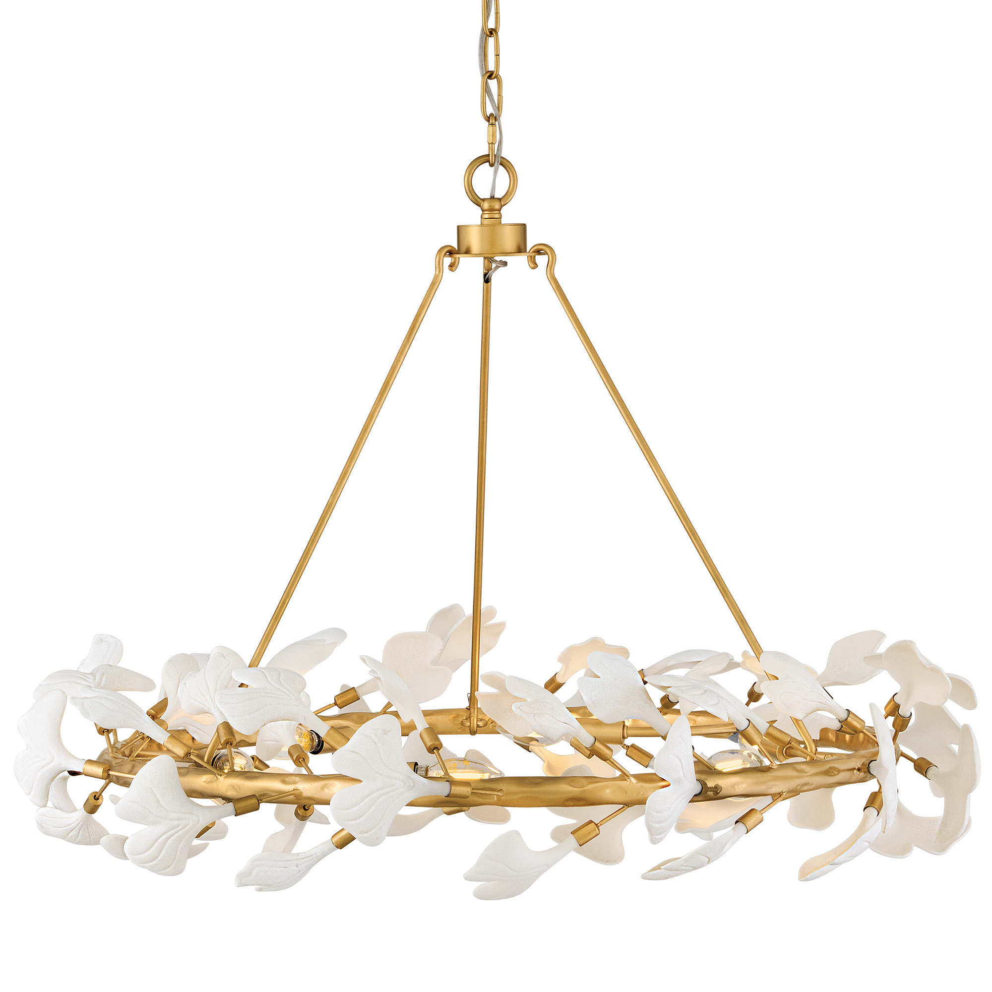 Adorned with delicate ceramic ginkgo leaves at the end of elegant hand-forged branches, the Audra Chandelier's enchanting frame features a gorgeous, hammered texture finished in Deluxe Gold. Exposed LED candelabra lamps cast a magnificent warm glow.