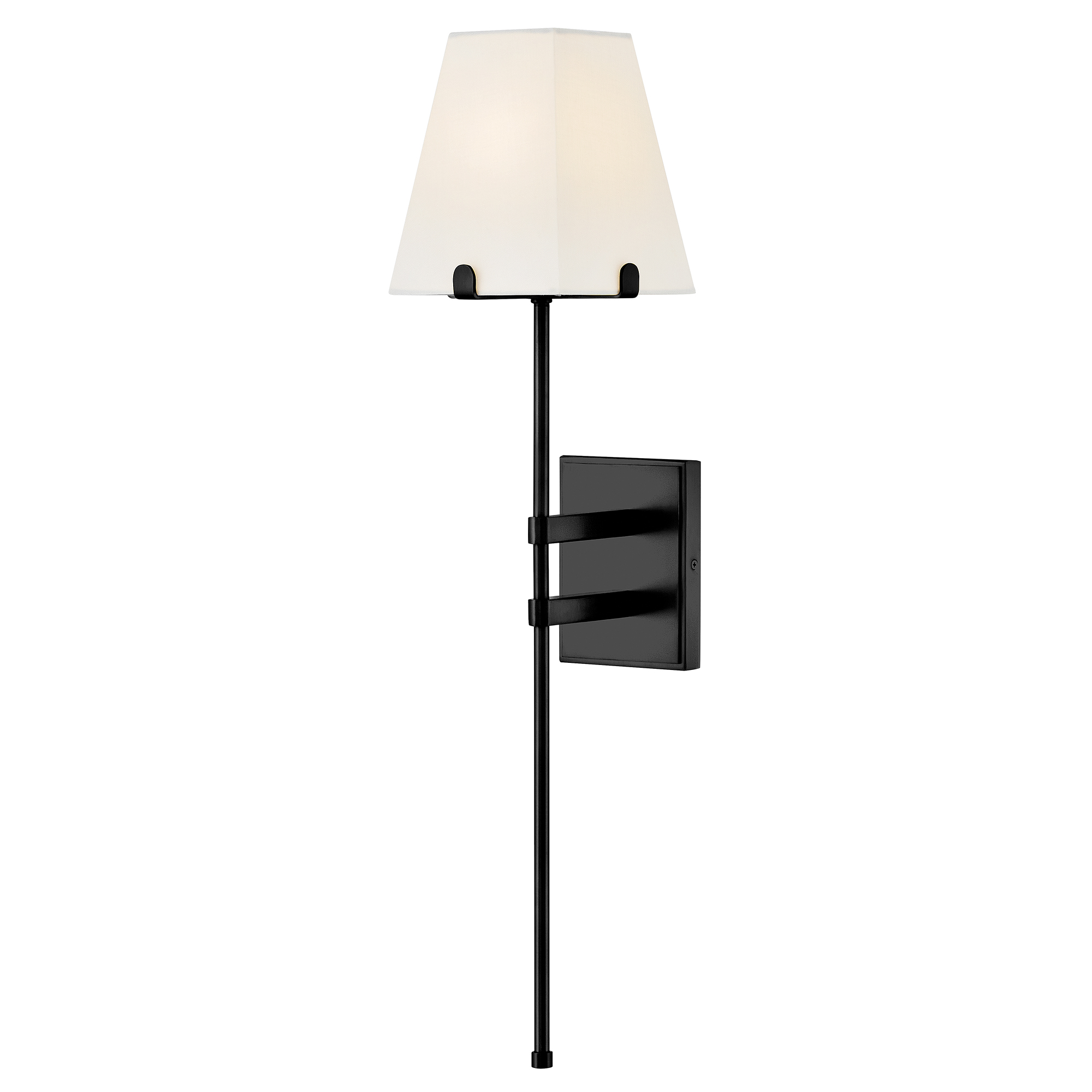 Tall and minimalist, the Benton Wall Sconce's simply chic silhouette easily complements any space or dcor style. White hardback linen shades are supported by a slim stem and prongs in a sleek finish.