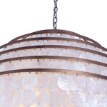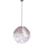 A modern makeover of the cascade Capiz chandelier, Sphere showcases natural, free hanging Capiz shells to create a natural shimmer effect. The Pearlized Antique Brass finish compliments the iridescent natural shells providing volume, all while giving your space a light and airy vibe.