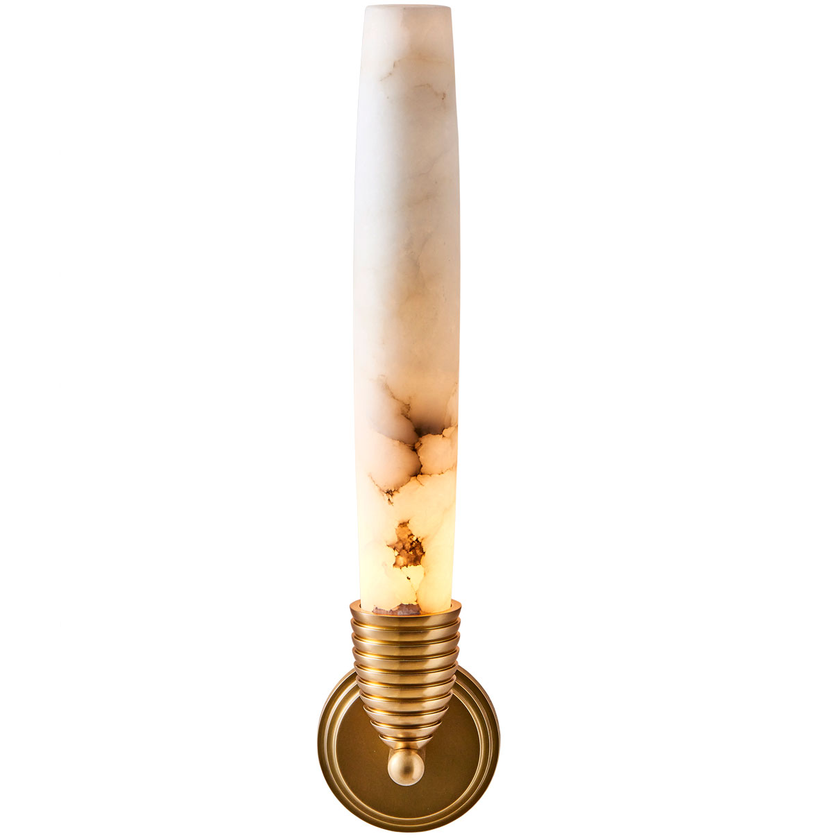 Botanically inspired by Pinecone shapes, the soft Art Deco design of the Gypsum wall sconce features a cylindrical slightly bulged natural Alabaster stone cylinder that diffuses the LED light and gives the fixture a softer luxurious look. Offered in True Brass with driverless LED technology.