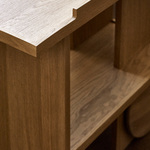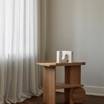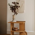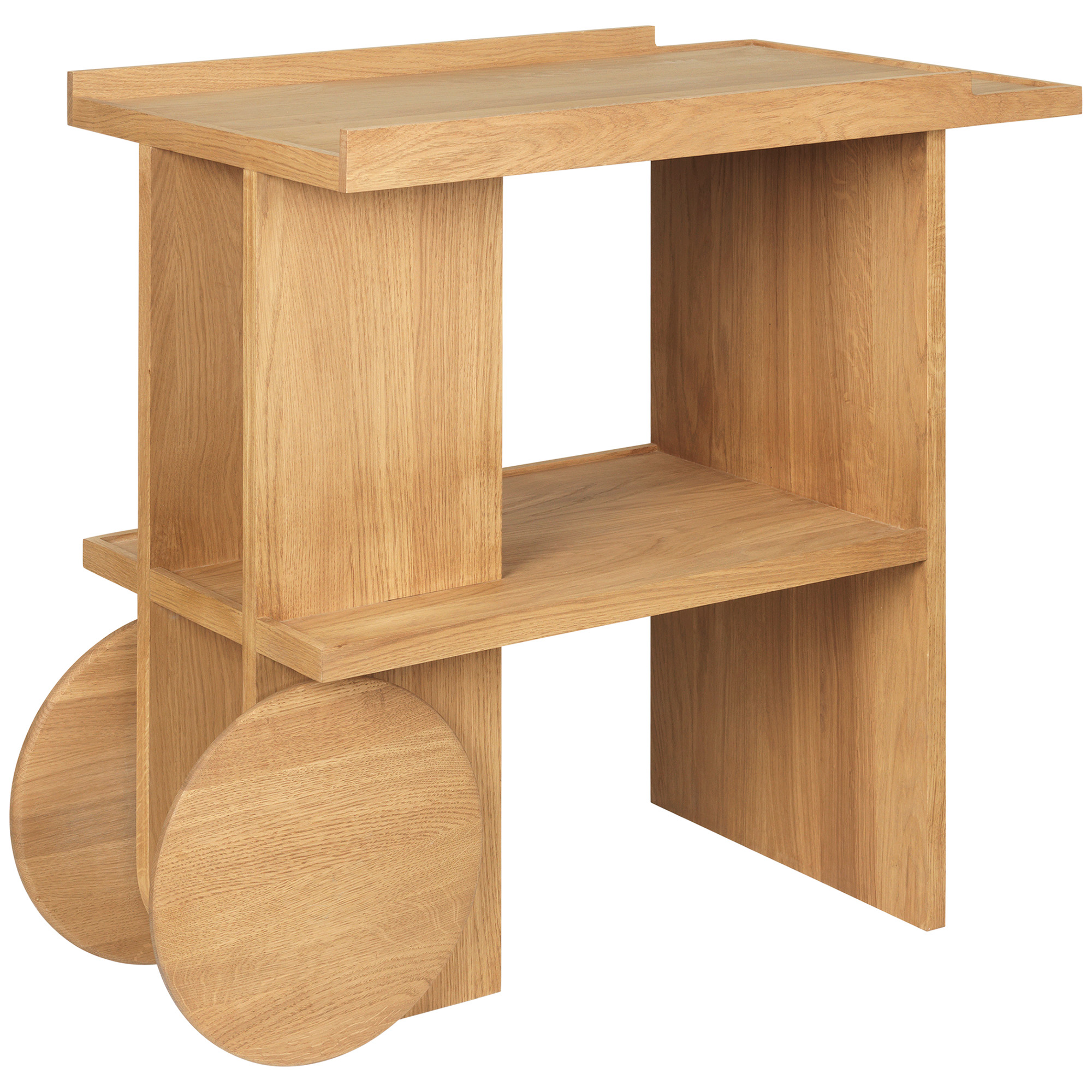 Referencing a classic bar trolley, the Axis Side Table playful reimagines a drink cart for the modern home. Simple geometric shapes create the unique form, including expressive wheels that allow for easy placement. The oak wood is finished in a clear lacquer to protect and enhance its qualities.