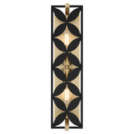 The Mariposa Bathroom Vanity Light is embellished with a repeating geometric floral pattern of matte black metal petals. These pieces contrast beautifully with aged brass frames. Exposed lamps enhance the collection's artful aesthetic and allow the light to interact with the decorative pattern, casting intricate shadows and creating a dynamic lighting effect. The overall design of the series, with its blend of shapely patterns and elegant finishes, makes it a perfect focal point for spaces such as dining rooms, living rooms, or entryways.