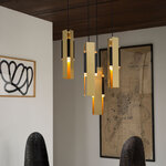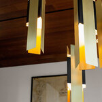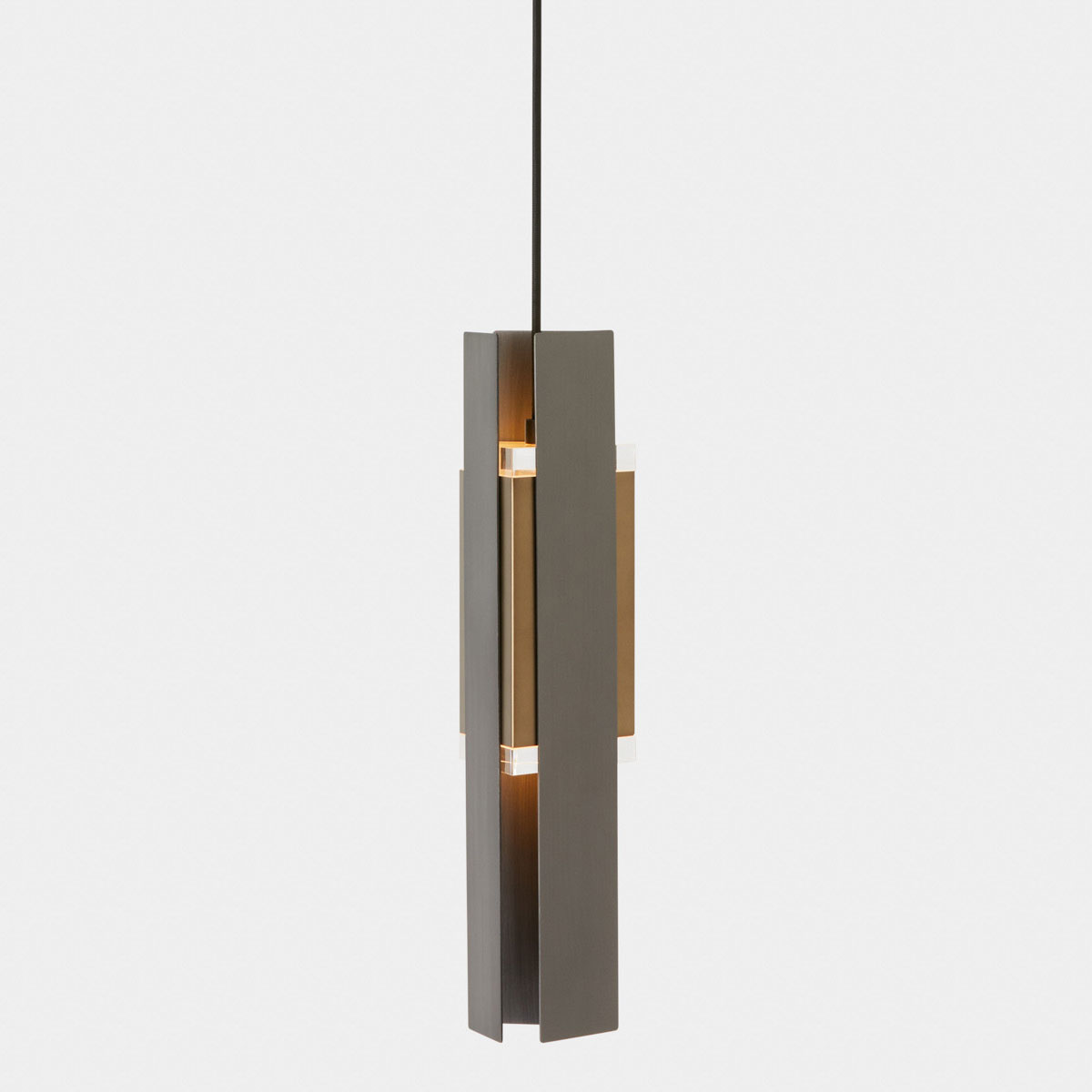 The Excalibur Pendant features a slightly Art Deco-inspired aesthetic with a modern twist. Light is spread from a pair of plexiglass prisms, which are surrounded by a trio of rectangular metal panels. Excalibur's soaring vertical lines recall the grandeur of the Art Deco era, while its rigid, geometric structure gives the fixture a contemporary touch.