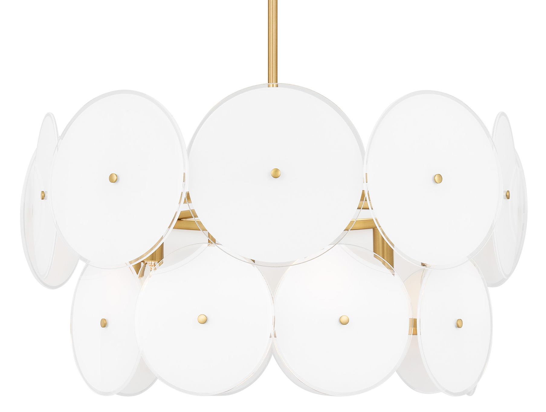 The Emery Chandelier showcases Kate Spade's signature design style with elegance and charm. Overlapping curved glass disks create a layered look while casting warm, ambient light throughout your space.