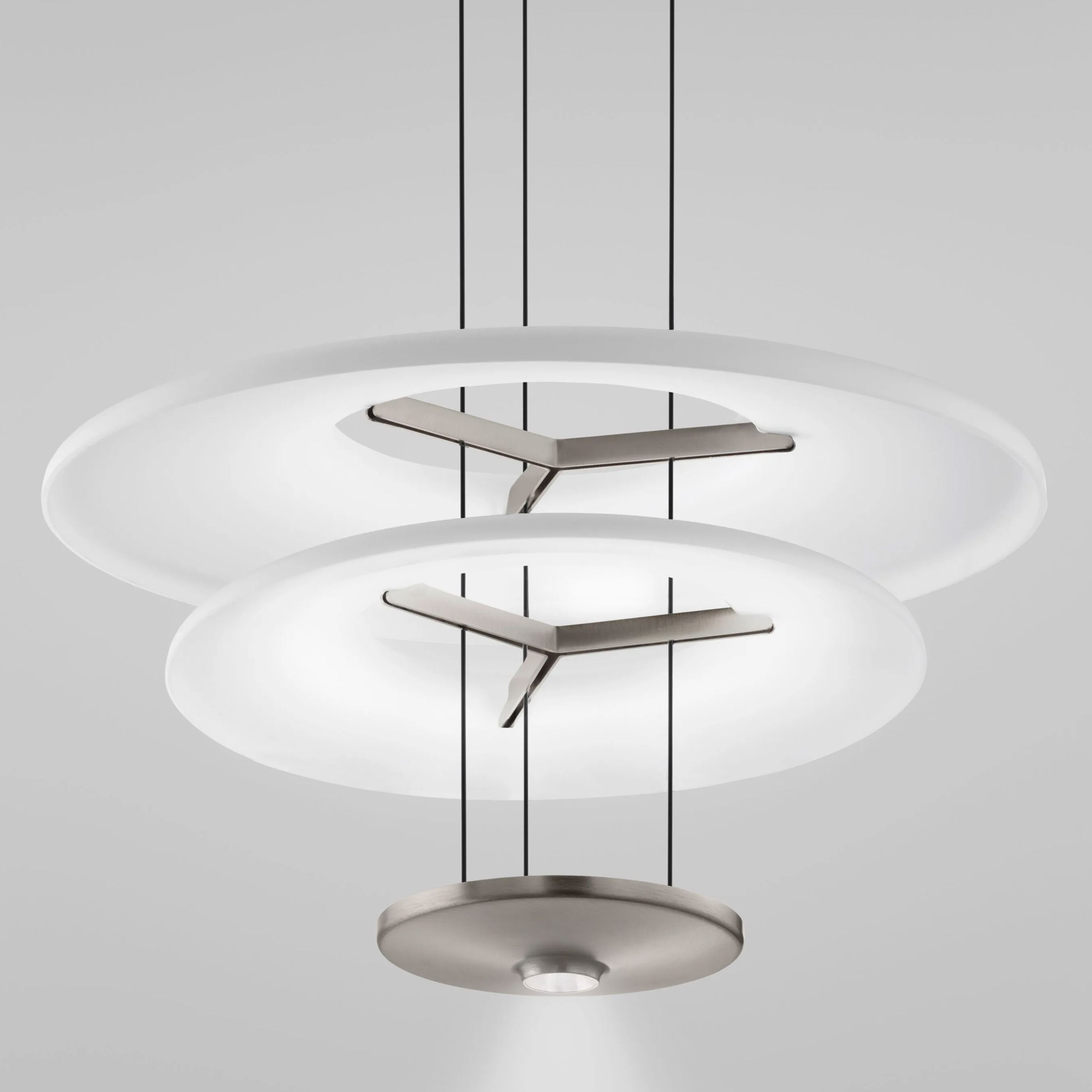 The Dione SP2 Pendant features a metal disc with 2 light sources, one that directs like downward and one that directs light upward, to provide both ambient and directed lighting. A pair of round glass shades above the metal disc can be raised or lowered along the cable, allowing for endlessly customizable configurations.