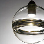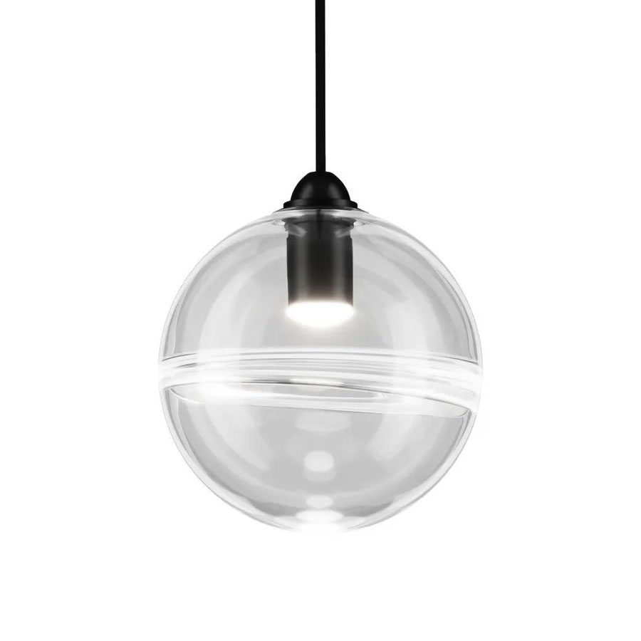 The Oro Pendant features a globe-shaped glass shade with a horizontal glass membrane that divides the sphere into two halves. The artisanal process used to create the glass results in slight variations of the inner glass that make each piece unique.