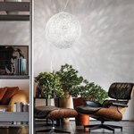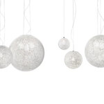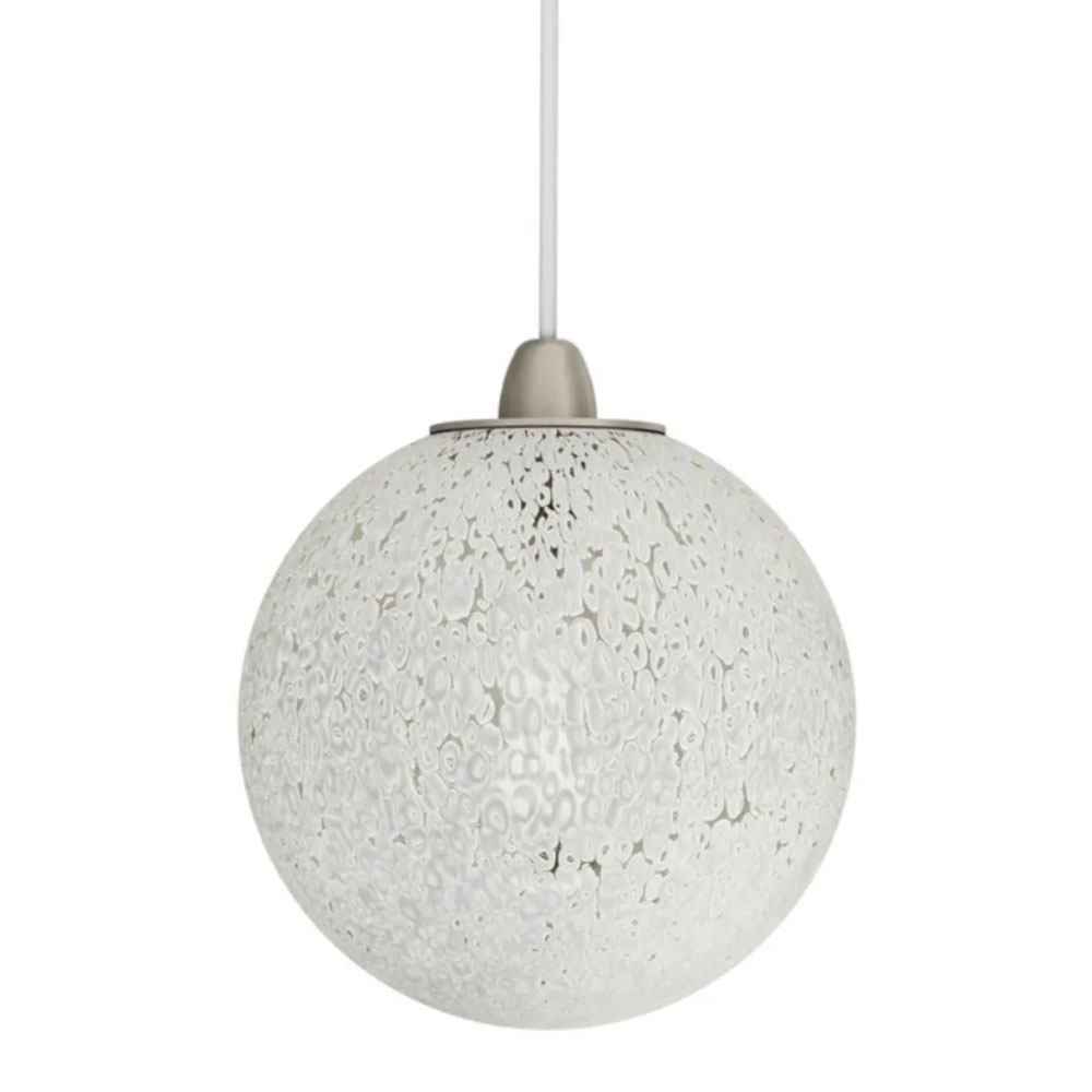 The Rina Pendant is inspired by dandelions with its spherical shape and unique lighting effect. The glass is made using a murrine effect, a traditional technique that creates a pattern of translucent white dots and clear spaces. As light passes through the glass, a dazzling pattern of light and shadow is cast upon the pendant's surroundings.