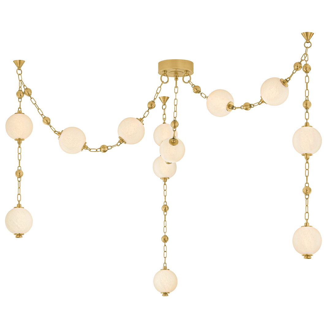 The Corda Chandelier draws inspiration from the elegance of heirloom jewelrywhere light becomes adornment, and structure tells a story. Hand-blown matte cloud glass spheres are suspended from gleaming chains, accented by delicate ball chain details, evoking the richness of layered pearl and charm necklaces. Corda's layered suspension system allows for customizable hanging methods, introducing an unexpected sense of movement and personalization. It brings a sense of intimacy and ornament to a space, casting a warm, glamorous glow that is both delicate and intentional.