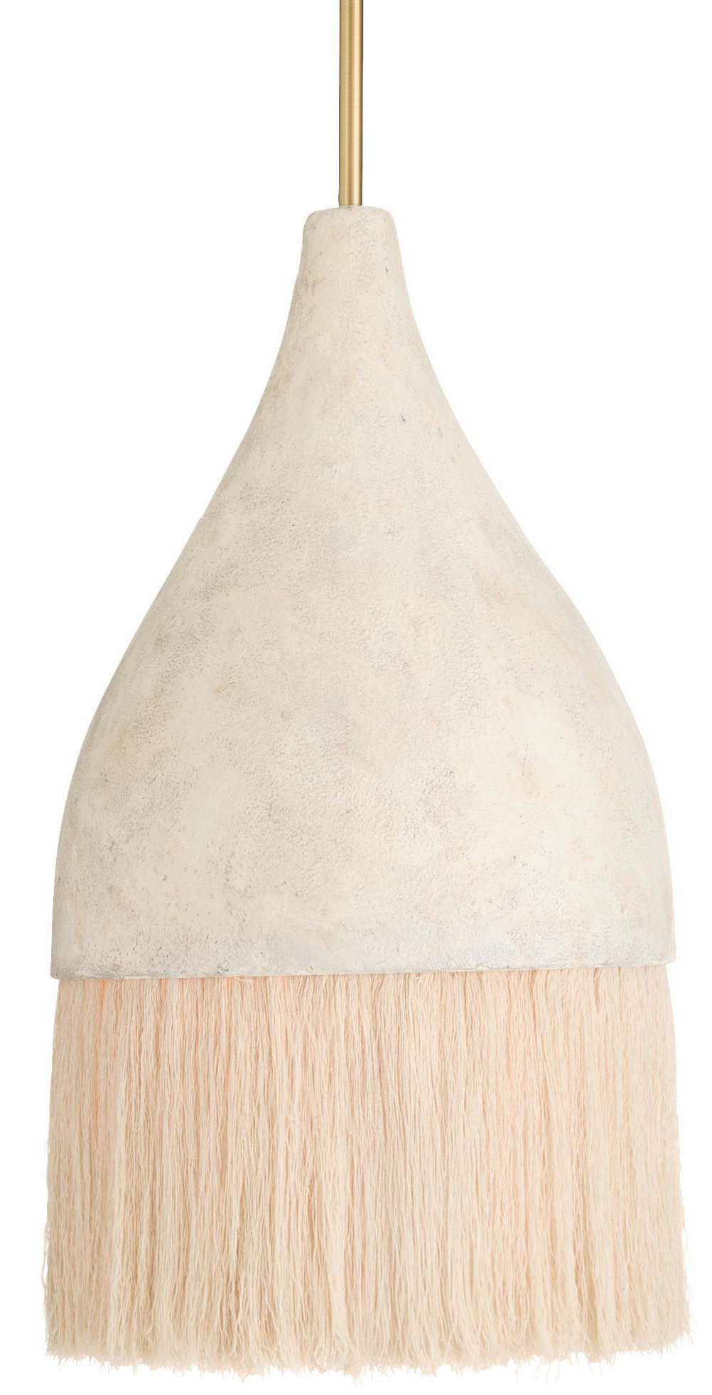 The Marley Pendant brings a calming Zen to your interior space. The slim stem holds a paper shade with bleached natural cotton fringe allowing warm shadows of light across your area.
