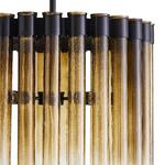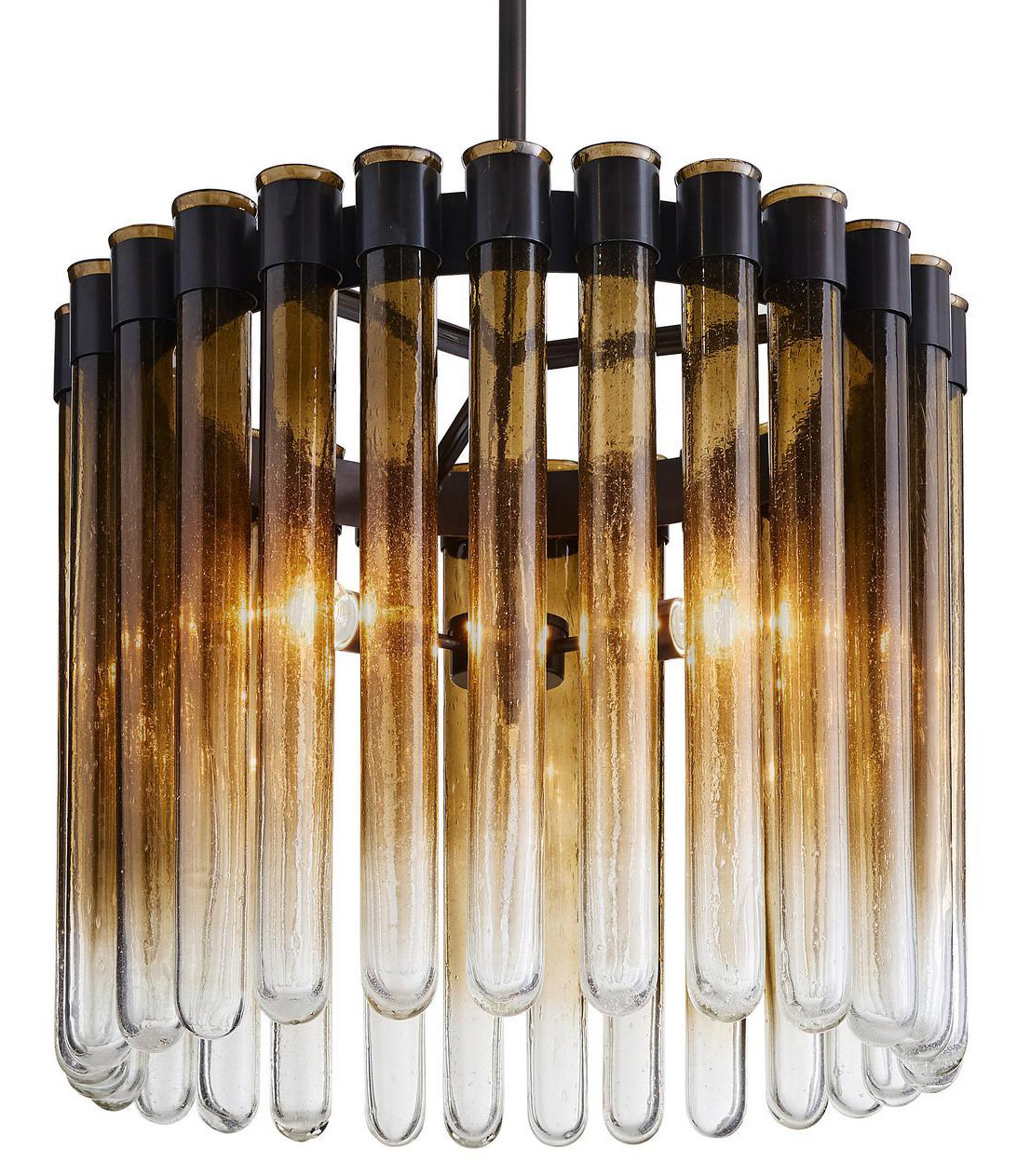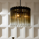 The Maxton Chandelier brings a dazzling presence to your interior space. The ring frame holds cylindrical pipes of mold blown seeded glass that goes from opacity and translucence to a smoke ombre, and cast sparkling shadows of light across your room. Acrylic discs at the top of they cylinders are provided to help prevent dust from accumulating.