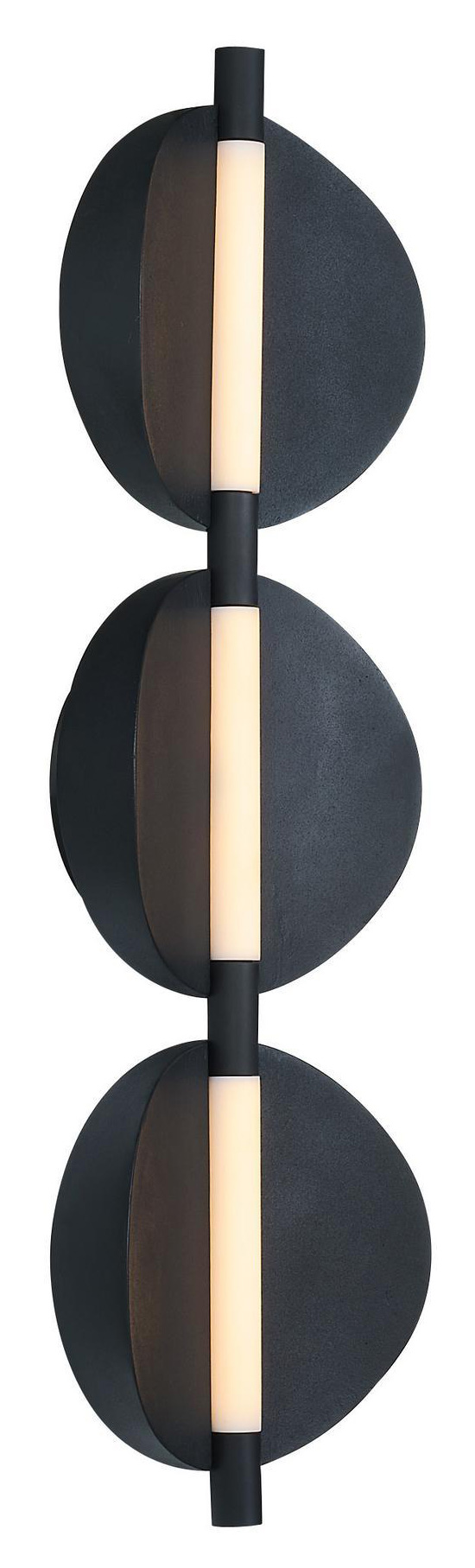The Luna Wall Light brings a sleek simplicity to your interior space. A trio of concave medallions form a dramatic backdrop to the lit acrylic tubes that cast warm shadows of light across your room..
