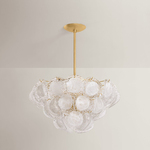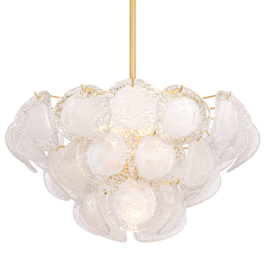 A celebration of maximalism, the Cedar Hill Stem Hung Chandelier is a whimsical tiered showpiece composed of painterly glass panels. Each suspended panel of Blonchino piastre glass curls slightly outwards, adding volume to the composition. Viewed from the side, Cedar Hill recalls a cluster of grapes on the vine; from below, it blooms like a rose.