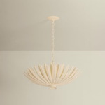 Leaning into a botanical motif, the Whitfield Chandelier is defined by elongated leaf-like metal pieces that form a glowing shade around the light source. As light emanates outwards, it filters through the layered foliage.