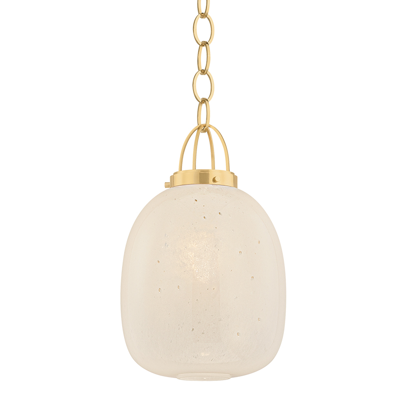 The Enosburg Pendant pairs a soft organic shape with novelty metalwork. An oblong cloud seedy glass shade is supported by a cage-like suspension and chain finished in Aged Brass. The bubbling of the glass attracts the eye with its subtle, energetic texture. Enosburg makes a compelling statement over a dining table or when grouped above a kitchen island.