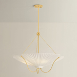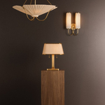 Drawing inspiration from the organic elegance of the Art Nouveau period, the Gerhard Pendant reinterprets floral motifs with architectural clarity. Gracefully arched metalwork in a warm Aged Brass finish supports sheer ivory linen shades, crafted with a unique pleating technique that adds volume and dimension. Together, these elements form abstracted botanical shapes that feel both refined and expressive.