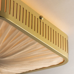 The Henri Semi Flush Ceiling Light reimagines the classic flush mount with a sculptural edge and purposeful detailing. A shallow square frame in Aged Brass features uniform perforations that offer both visual texture and functional ventilation. The pleated silk shade lends a refined softness, creating a warm glow that complements the fixture's clean architectural lines.